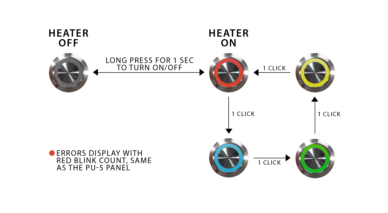 The heater will operate in 5 power modes that can be changed by clicking the panel.