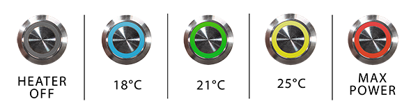 The AUTOTERM Travel Box 2.0 can be operated by a single button that’s located on top of the heater. When operating without an external temperature sensor, the heater works in 4 power levels, but with it, it’s possible to set 3 different target temperatures.