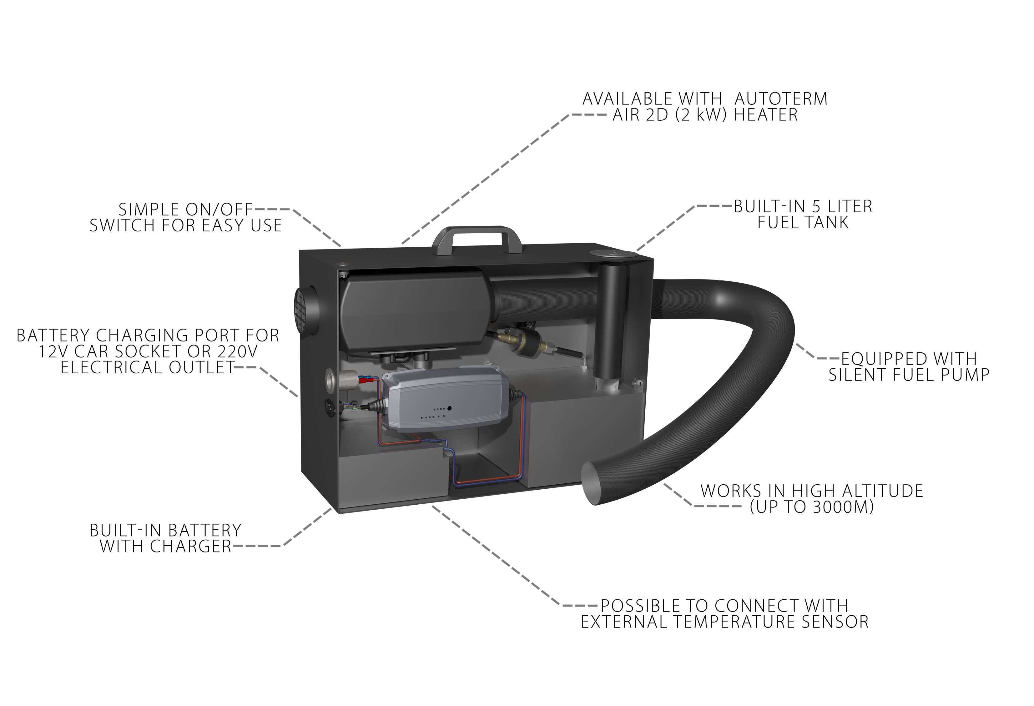 Being the size of a suitcase and weighing only 22,5kg with a full fuel tank gives the chance to save space and be mobile while keeping most of AUTOTERM’s features.